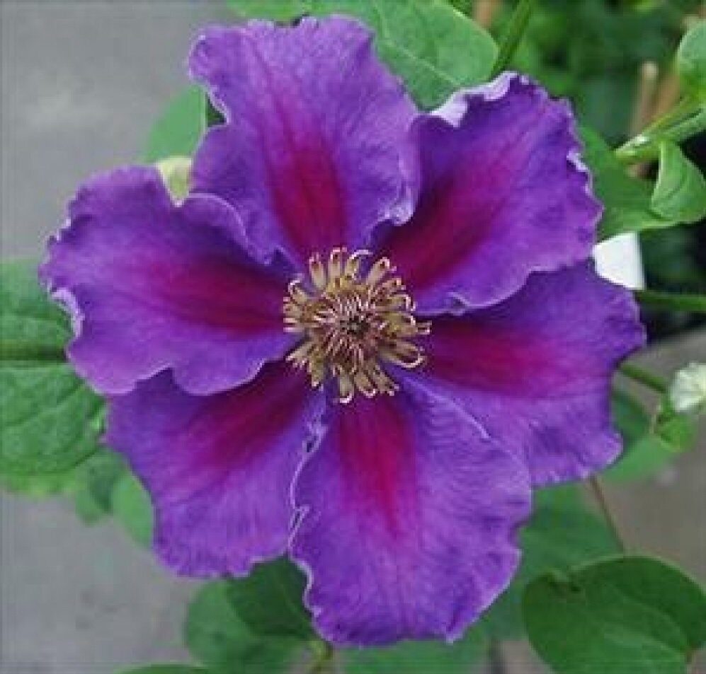 Сорт с пурпурно-фиолетовыми цветками округлой формы с красной полоской посредине лепестка и более темным основанием. Цветки диаметром 5-8 см, сложенные чаще всего из 6 почти круглых чашелистиков с замысловато изогнутыми краями. Тычинки с пурпурными пыльниками на бело-розовых нитях. Обильно цветет на побегах текущего года в июне-сентябре. Растет компактно, достигает высоты 1,5-2 м.