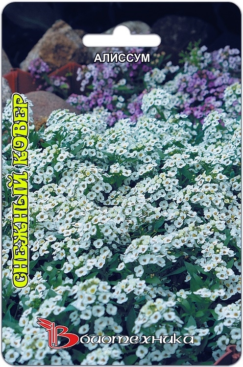 Алиссум СНЕЖНЫЙ КОВЕР Однолетнене растение. Высота 10-12 см. Прорастание: 10-15 дней при 22-25 оС. Рассада: 4-5 недель при 20-25 о С. Высадка в открытый грунт: первая декада июня. Начало цветения: середина июня. Возможен безрассадный способ выращивания прямым посевом в открытый грунт, в этом случае начало цветения сдвигается на конец июля, требуется прореживание растений. br> Карликовая форма алиссума, формирующего кустики шаровидной формы усыпанные белыми цветками, образующими сплошной белый ковер. . Сохраняют декоративность все лето до наступления заморозков. Незаменимое растение для формирования бордюров и обсадки клумб, а так же для вазонов.